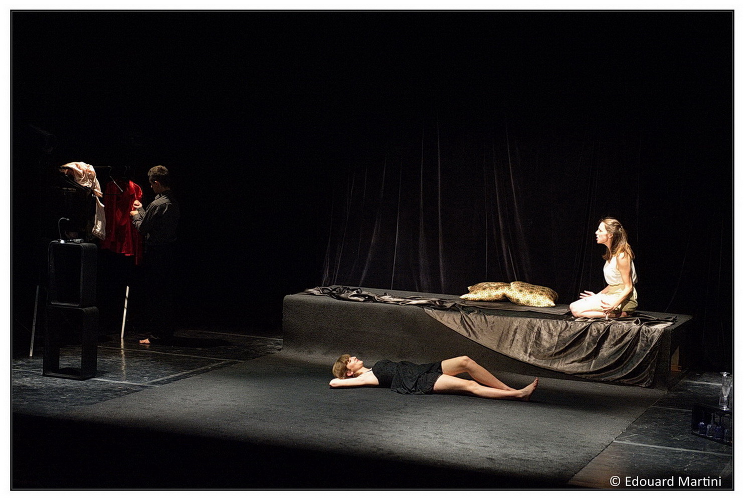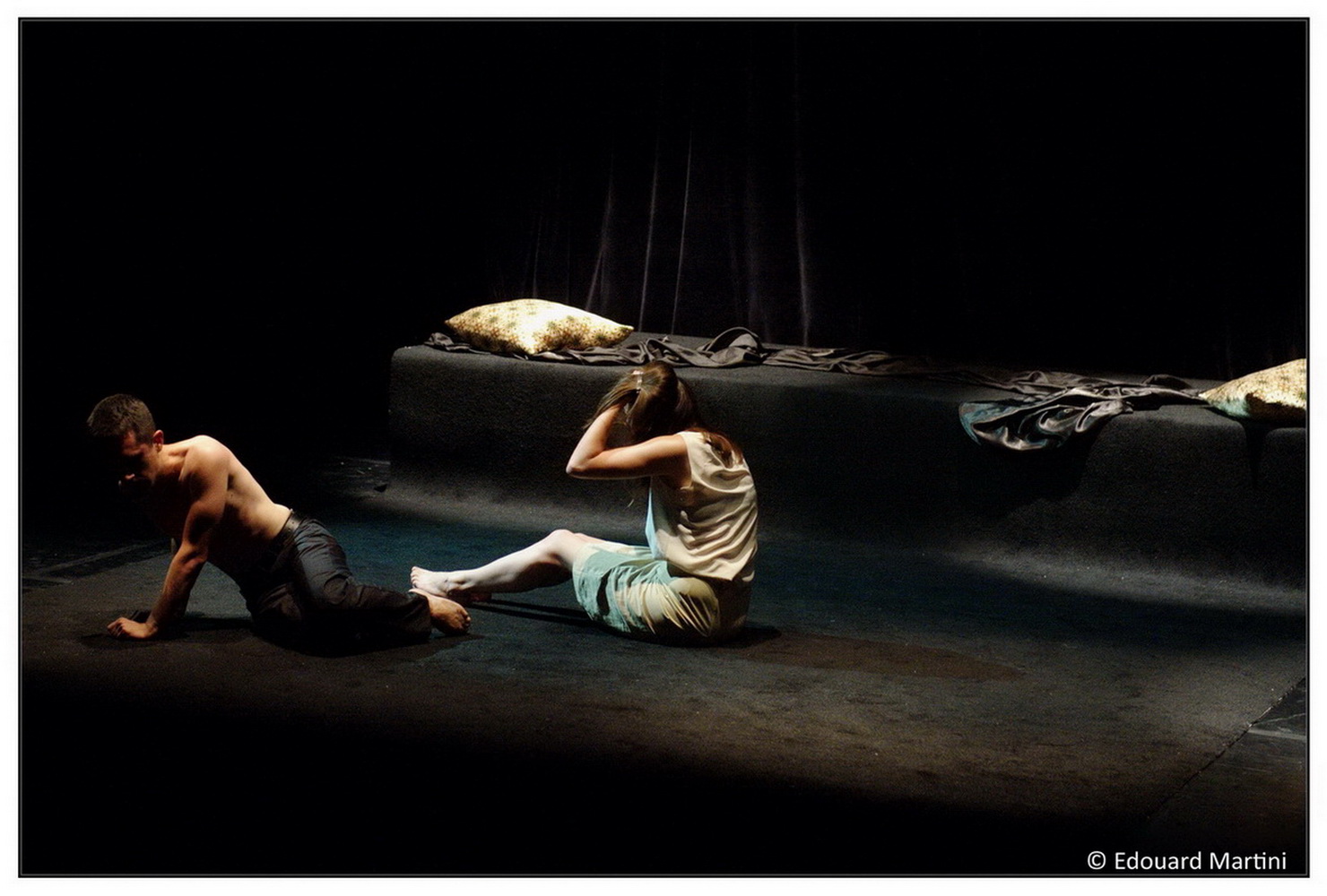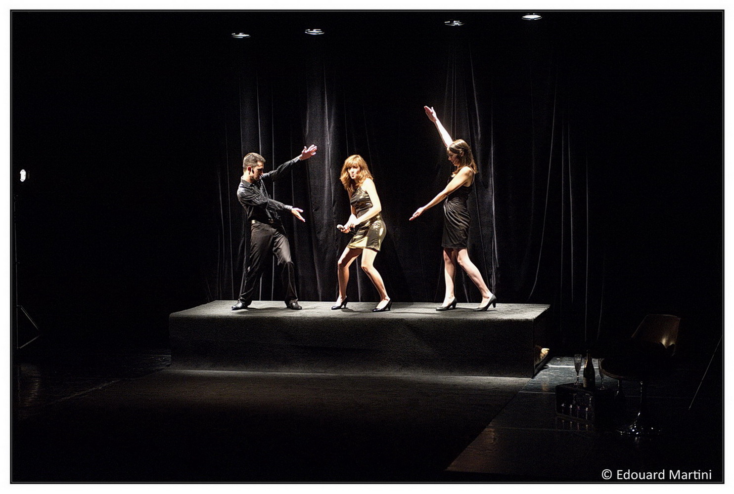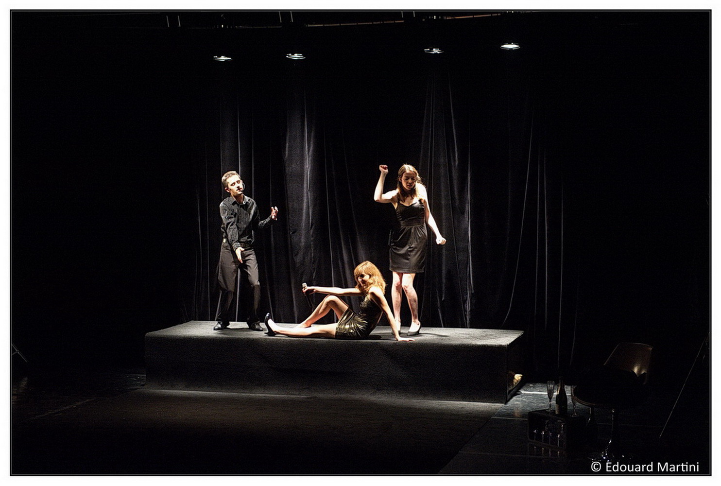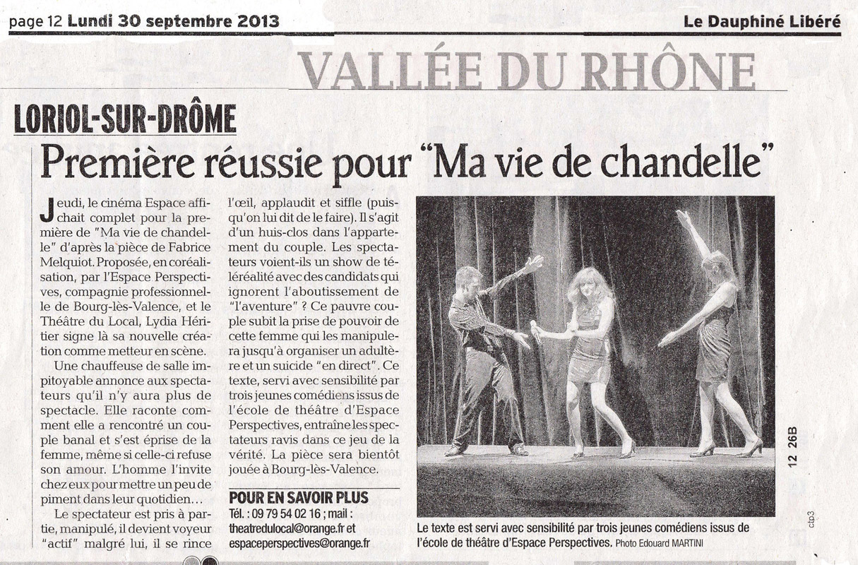 Voilà ce que pourrait être le 'pitch" de cette pièce, mais cela ne suffirait pas à Fabrice Melquiot qui aime nous surprendre et se jouer de nous ! Dès le début, le"quatrième mur" est brisé : le spectateur, d'ordinaire bien au chaud dans son fauteuil, est pris à parti, manipulé, il devient voyeur "actif", et tout en sirotant sa coupe de champagne (pour les chanceux), il se rince l'œil (puisqu'on lui dit de le faire), applaudi et siffle, et participe ainsi à la chute mortelle de ce pauvre couple accablé par une chauffeur de salle impitoyable.